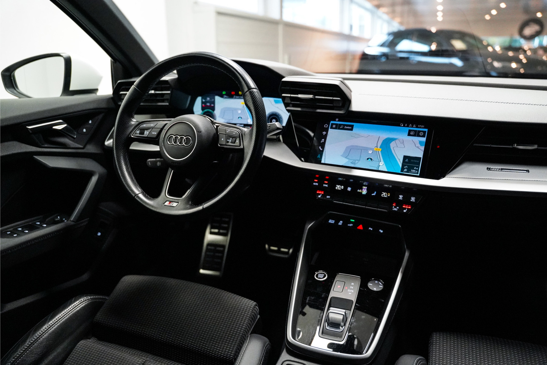 • Sportstuurwiel, multifunctioneel in leder, driespaaks met schakelpaddels