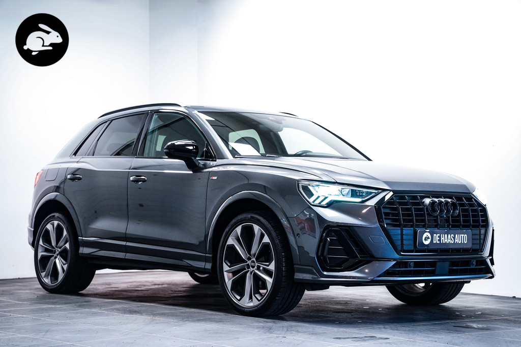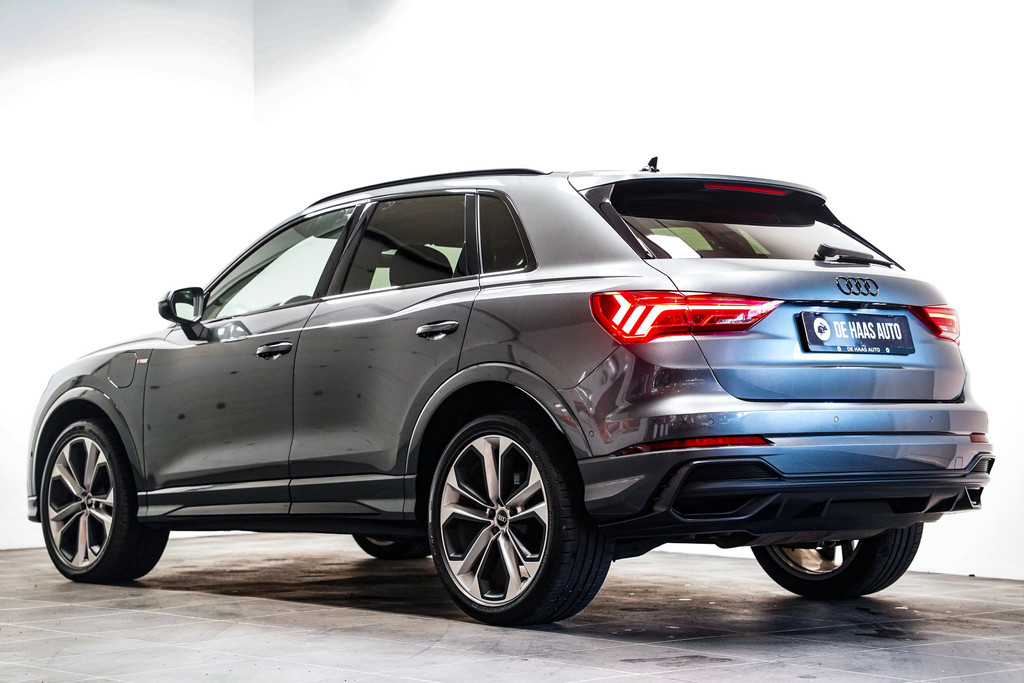 Een bloedmooie Audi Q3 45e S-Line afkomstig van de Audi dealer met o.a. matrix led, 20 inch, zwart optiek, leder/alcantara sportstoelen, een zwenkbare trekhaak, adaptive cruise control, een 360* rondomzicht camera, sfeerverlichting en een elektrische klep!