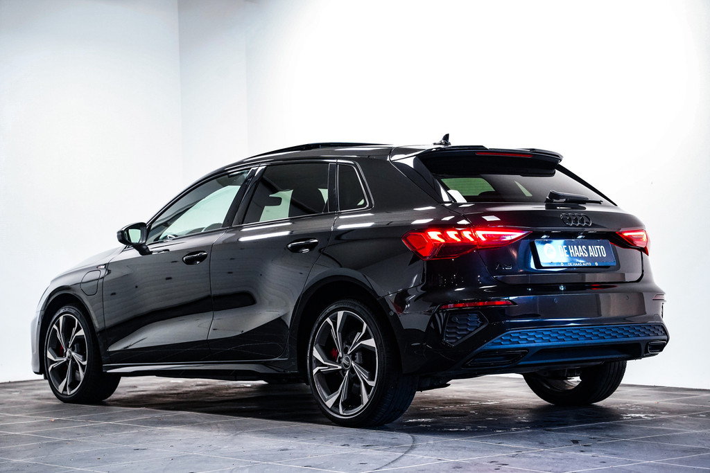 Een fraaie Audi A3 Sportback 45e S-Line met o.a. zwart optiek, 18 inch, matrix led, half lederen sportstoelen, panorama dak, navigartie, side assist, adaptive cruise control, camera en een elektrische klep.